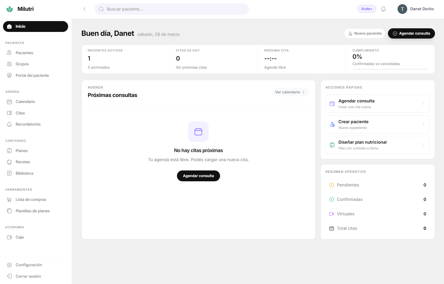 Agenda, historia clínica, planes alimentarios y portal de pacientes. Todo conectado para que te dediques a lo que importa.