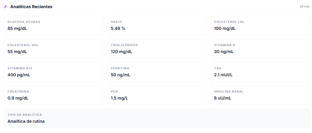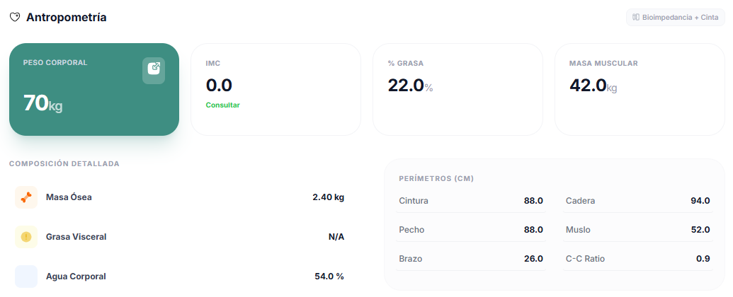 Antropometría, antecedentes, analíticas y evolución. Todo el contexto de tu paciente en una vista.