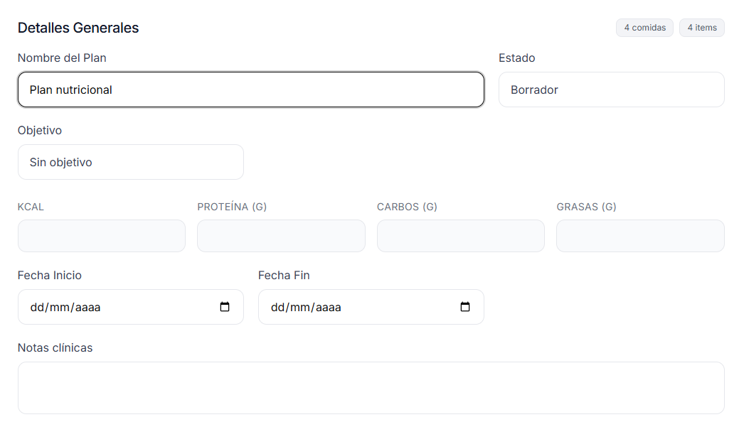 Creá planes con macros, fechas y notas clínicas. Exportá en PDF o compartilos al portal.